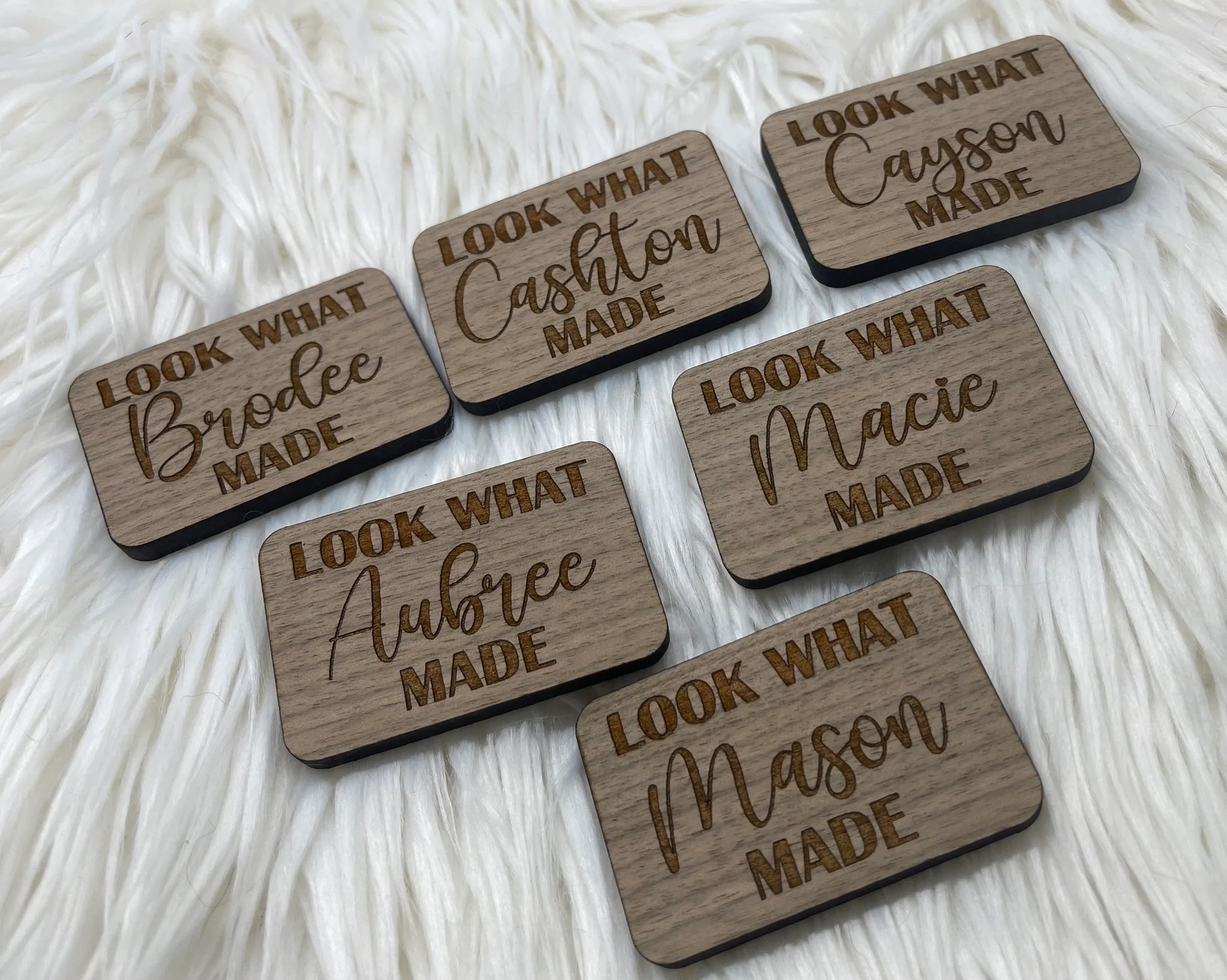 What better way to display your kids art on the refrigerator then these engraved magnets?? These custom magnets are made from 1/4” walnut, with a sturdy magnet on the back. They measure about 2.5” x 1.75”. These are not stained, this is the natural color.